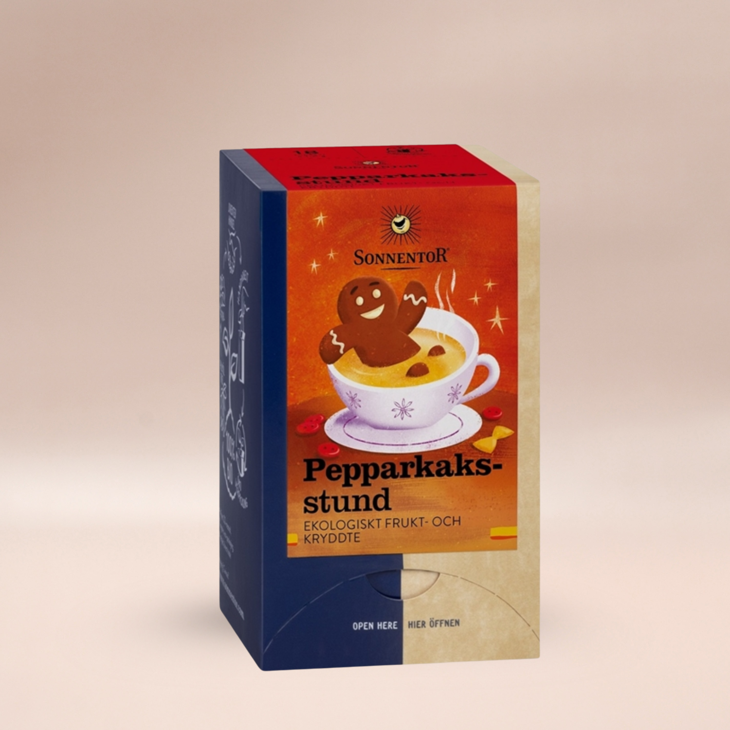 Ekologiskt Pepparkakste – från Sonnentor Låt julstämningen sprida sig i varje kopp! Det här ekologiska teet bjuder på en värmande kryddblandning med klassiska toner av pepparkaka – en smak som för tankarna direkt till advent, tända ljus och vintermys. Sonnentor, som grundades i Österrike 1988 av Johannes Gutmann, samlar landsbygdens bästa smaker under sitt välkända varumärke med den leende solen. Alla produkter är ekologiska, noga utvalda och framställda med högsta kvalitet – och detta te är inget undantag. Perfekt att avnjuta under kalla dagar, som en sockerfri jultradition i flytande form.