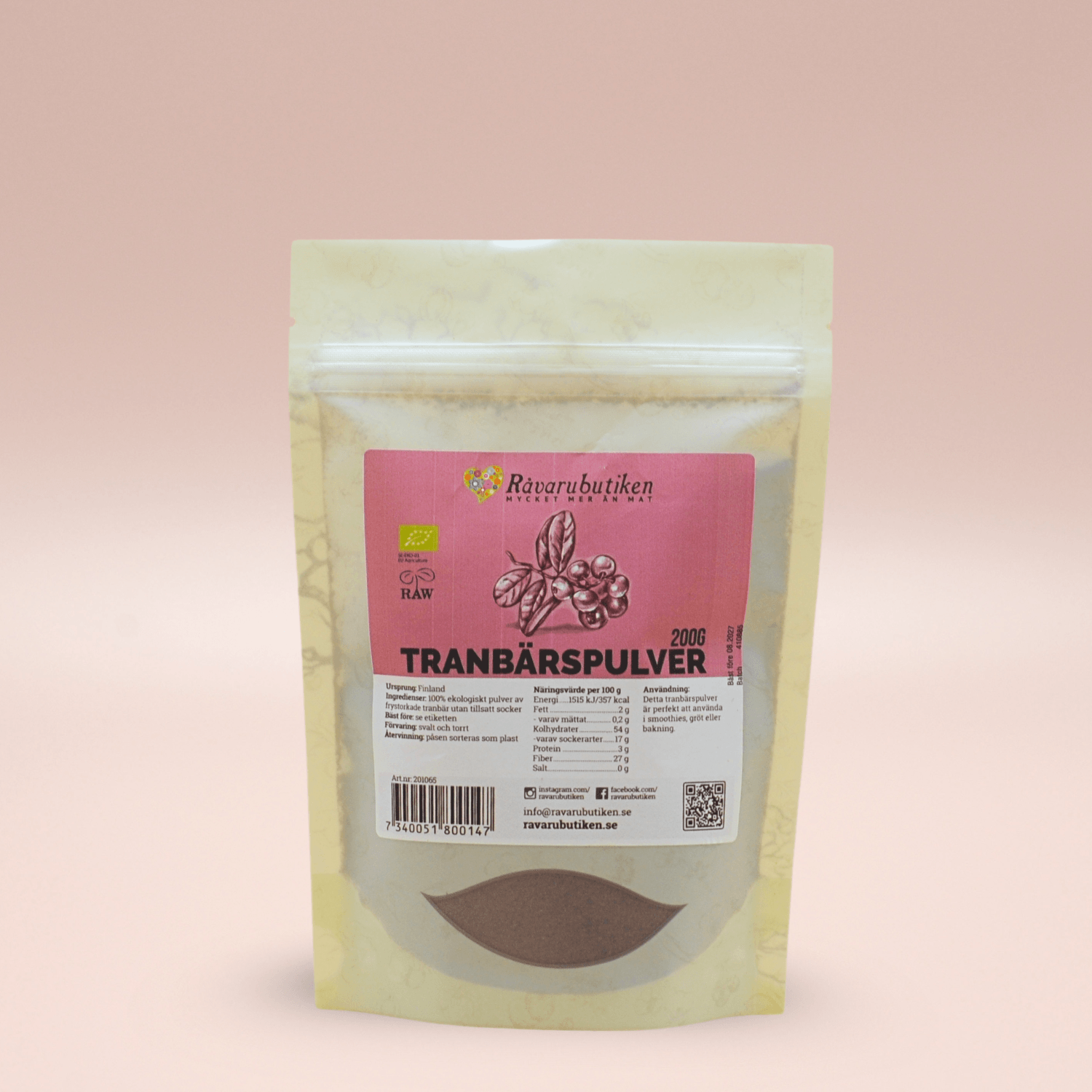 Vårt tranbärspulver är gjort av frystorkade tranbär plockade i Finland, bären mals sedan försiktigt ner för att bevara så mycket som möjligt utav nyttigheterna.