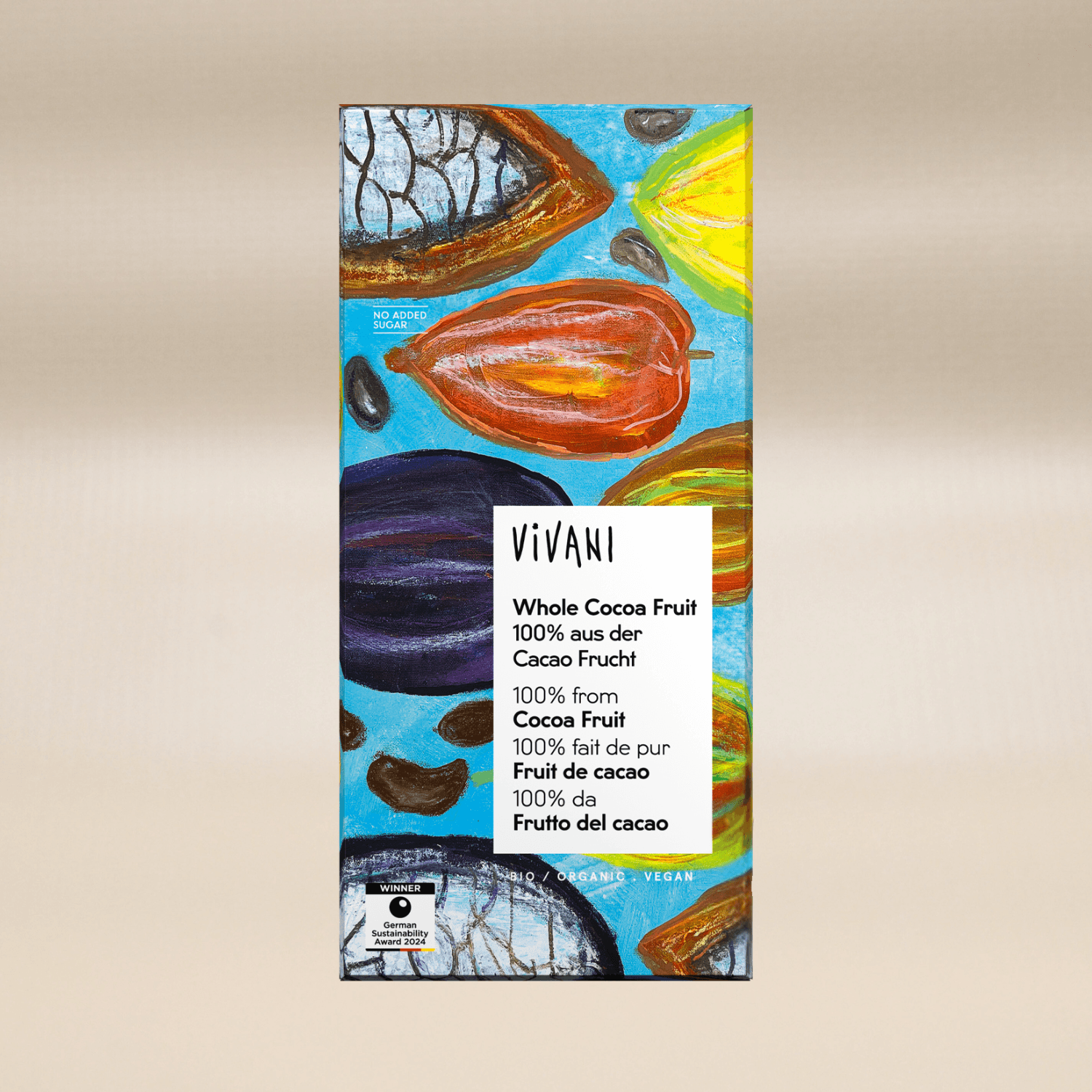Denna unika choklad är tillverkad av 100 % kakaofrukt – inte bara bönan, utan hela frukten. Till skillnad från traditionell 100 % choklad upplevs den inte lika bitter. Hemligheten ligger i att receptet innehåller 27 % kakaofruktflingor, framställda av fruktköttet (pulpan) som omger kakaobönan.